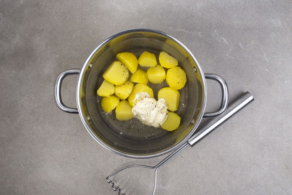 Die Kartoffeln in das kochende Wasser geben und ca. 15-20Min. kochen. Mit einem Messbecher ca. 1 Tasse Kochwasser abschöpfen. Die Kartoffeln in ein Sieb abgießen, kurz abtropfen lassen, zurück in den Topf geben und mit der 1/2 der Crème fraîche zu einem Püree stampfen, dabei nach Bedarf noch etwas Kochwasser hinzufügen. Mit Salz und Pfeffer abschmecken.