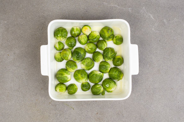 Eine Auflaufform mit 1–2EL Olivenöl ausstreichen. Den Rosenkohl mit der Schnittseite nach unten in die Form geben, mit Salz und Pfeffer bestreuen und ca. 15Min. im Ofen knusprig backen. Nach ca. 10Min. den Rosenkohl wenden.