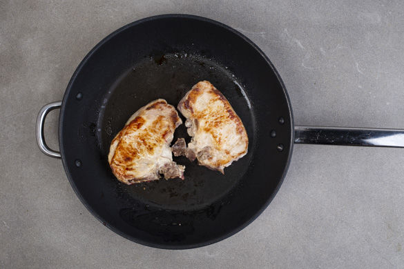 Die Koteletts in einer großen Pfanne mit 1EL Olivenöl bei starker Hitze auf jeder Seite 2–3Min. scharf anbraten, bis sie goldbraun und gar sind. Aus der Pfanne nehmen, salzen und pfeffern und abgedeckt warm halten. Die Zwiebeln in derselben Pfanne im Bratfett ca. 3–4Min. knusprig braten, aus der Pfanne nehmen und auf etwas Küchenkrepp abtropfen lassen.