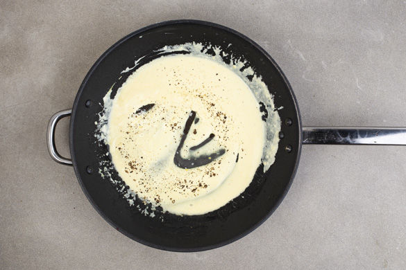 Die Pfanne erneut erhitzen und den Bratensatz mit 100–150ml Wasser ablöschen. Die restliche Crème fraîche und Senf nach Geschmack einrühren. Die Sauce bei mittlerer Hitze etwas andicken lassen und mit Salz und Pfeffer würzen. Die Koteletts mit dem Püree und dem Rosenkohl anrichten. Die Zwiebeln auf dem Püree verteilen und servieren.