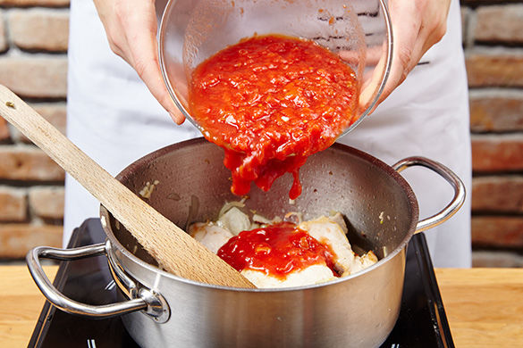 In einem mittelgroßen Topf 2EL ÖL stark erhitzen und die Hähnchenbruststreifen ca. 1-2Min. scharf anbraten. Nun die Zwiebel und den Knoblauch für weitere 2-3Min. anbraten. Schließlich mit den gehackten Tomaten sowie 200ml Wasser ablöschen und ca. 10Min. bei mittlerer Stufe köcheln lassen. Mit Salz, Pfeffer und 1TL Zucker würzen.