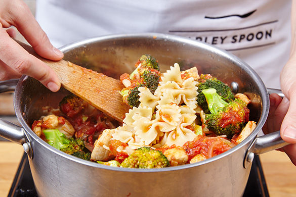 Die Farfalle nun mit der Hähnchen-Gemüse-Sauce vermischen. Zum Schluss mit dem Italian Allrounder abschmecken. Evtl. noch etwas Nudelwasser hinzufügen, falls das Gericht zu trocken erscheint und mit dem Basilikum garniert servieren.