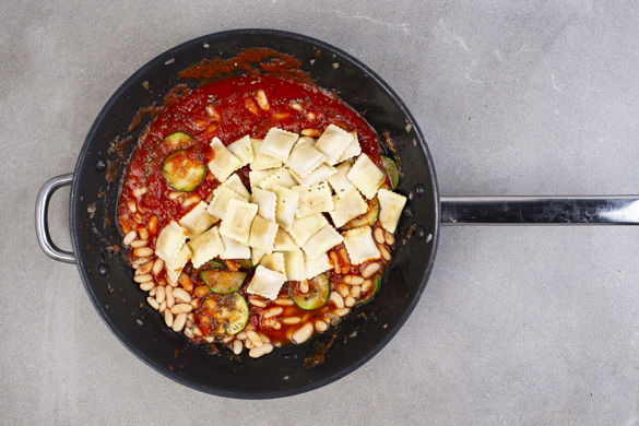 Die Ravioli unter die Sauce heben, mit Salz und Pfeffer würzen und alles abgedeckt ca. 2–3Min. sanft köcheln lassen.