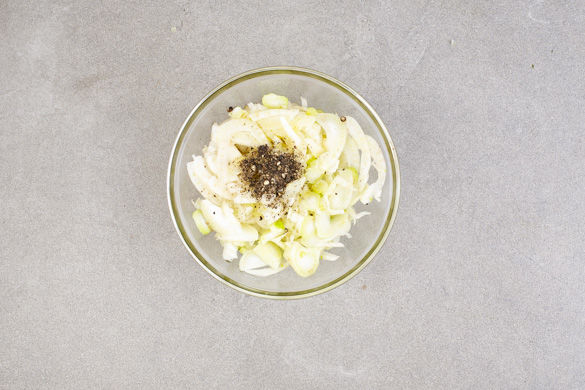 Inzwischen den Fenchel mit einer Reibe oder einem Gemüsehobel in feine Scheiben hobeln. Tipp: Man kann den Fenchel auch mit einem Messer in hauchdünne Streifen schneiden. Aus 2–3EL Olivenöl, 1EL Essig und 1 Prise Salz ein Dressing anrühren und mit dem Fenchel mischen. Den Ravioli-Zucchini-Auflauf mit dem Fenchelsalat anrichten und servieren.