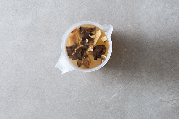 Den Backofen auf 200°C Umluft (220°C Ober-/Unterhitze) vorheizen. In einem Wasserkocher 800ml Wasser aufkochen und die Steinpilze mit 1TL Salz im heißen Wasser ca. 5Min. einweichen. Anschließend die Pilze aus dem Wasser nehmen, klein schneiden und bis zur weiteren Verwendung beiseitelegen. Den Pilzsud aufbewahren.