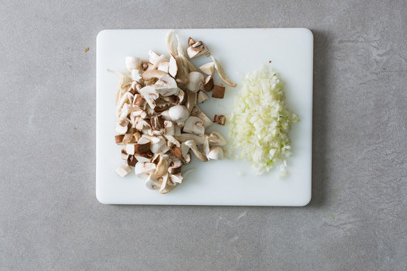 Inzwischen die Champignons ggf. mit etwas Küchenkrepp oder einer Bürste säubern und je nach Größe halbieren oder vierteln. Die Zwiebel schälen und in feine Würfel schneiden.