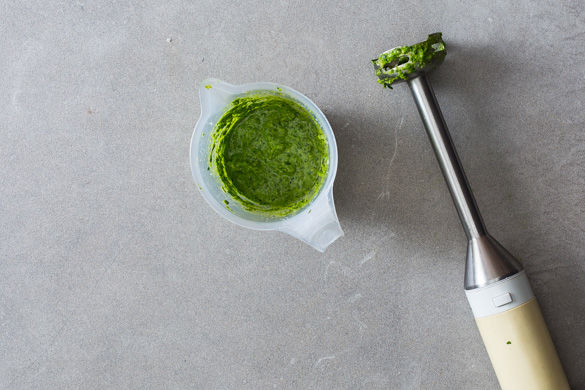 Für das Pesto die Basilikumblätter von den Stängeln zupfen und die Petersilie samt Stängeln grob hacken. Den Käse fein reiben. Die Kräuter mit der 1/2 des Käses, den Cashews und 2–3EL Olivenöl mit einem Stabmixer pürieren und mit Salz und Pfeffer sowie etwas Essig abschmecken. Tipp: Wer das Pesto etwas dünnflüssiger mag, kann noch etwas Wasser hinzufügen.