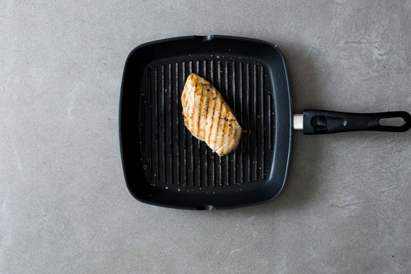 Die Hähnchenbrust mit etwas Küchenkrepp trocken tupfen, von beiden Seiten mit Salz und Pfeffer würzen, mit etwas Olivenöl einreiben und in einer ofenfesten Grill- oder mittelgroßen Pfanne ca. 2–3Min. von jeder Seite anbraten, dann ca. 10–12Min. im Ofen fertig garen. Tipp: Den Griff der Pfanne ggf. mit Alufolie umwickeln.