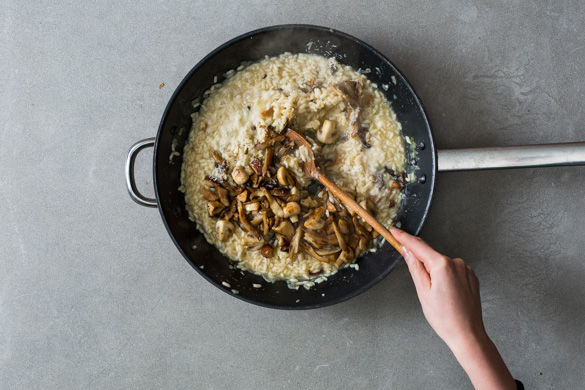 Die Zwiebeln in einer großen Pfanne mit 1EL Olivenöl auf mittlerer Stufe ca. 1–2Min. farblos anschwitzen, dann den Reis unterrühren und ca. 1Min. anrösten. Nach und nach mit Pilzsud ablöschen und rühren, bis der Reis den Sud aufgesogen hat. Den Vorgang 18–20Min. lang wiederholen, bis der Sud aufgebraucht und der Reis gar ist. Die Steinpilze untermischen.