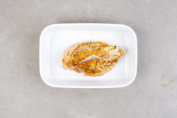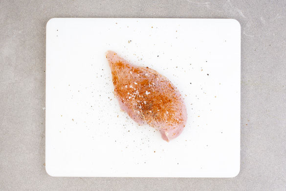 Den Backofen auf 180°C Umluft (200°C Ober-/Unterhitze) vorheizen. Die Hähnchenbrust mit etwas Küchenkrepp trocken tupfen, dann mit ca. 1/3 der Gewürzmischung sowie Salz und Pfeffer würzen. In einem großen Topf ausreichend gesalzenes Wasser für die Pasta zum Kochen bringen.