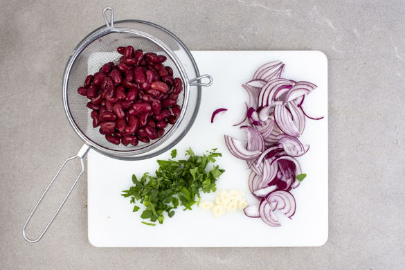Die Zwiebeln schälen, halbieren und in dünne Streifen schneiden. Den Knoblauch schälen und in feine Scheibchen schneiden. Die Korianderblätter von den Stängeln zupfen und grob hacken. Die Bohnen in ein Sieb abgießen und abtropfen lassen.