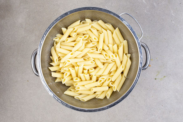 Sobald das Wasser kocht, die Pasta in das Wasser geben und leicht köchelnd in ca. 9–11 Min. bissfest garen. Die Nudeln in ein Sieb abgießen und abtropfen lassen.