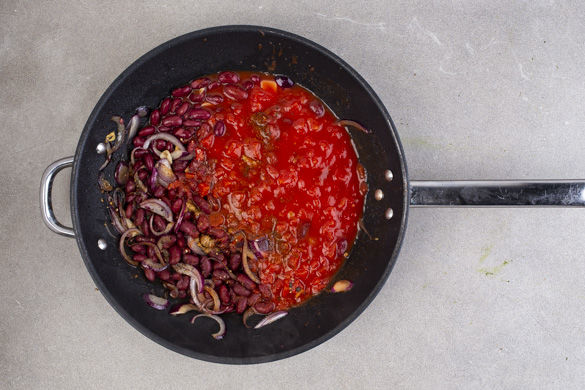 Die Zwiebeln und den Knoblauch in der Pfanne mit 3–4EL Öl ca. 1–2Min. anbraten. Mit den Tomaten ablöschen, die Bohnen und den Brühwürfel unterrühren und 3–4Min. köcheln lassen. Mit Salz, Pfeffer, 1 Prise Zucker, Limettensaft und restlicher Gewürzmischung abschmecken. Die Pasta unterheben und mit dem Hähnchen, der Avocado und Koriander garniert servieren.