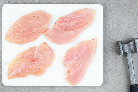 Das Fleisch trocken tupfen und jeweils horizontal halbieren, sodass insgesamt 8 Schnitzel entstehen. Die Schnitzel mit einem Fleischklopfer oder dem Boden einer schweren Pfanne ca. 0,5cm dünn plattieren.