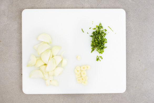 Die Zwiebel schälen, halbieren und in dünne Streifen schneiden. Den Knoblauch schälen und in feine Scheibchen schneiden. Den Koriander samt Stängeln fein hacken.