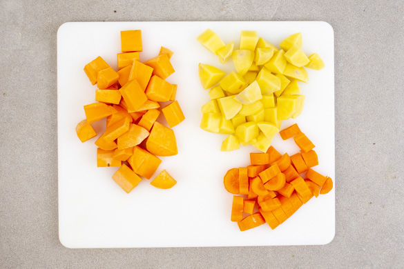 Die Süßkartoffel schälen und in ca. 2cm große Würfel schneiden. Die Kartoffeln schälen, längst vierteln und in ca. 1cm große Würfel schneiden. Die Karotten schälen, längs halbieren und ebenfalls in ca. 1cm kleine Stücke schneiden.
