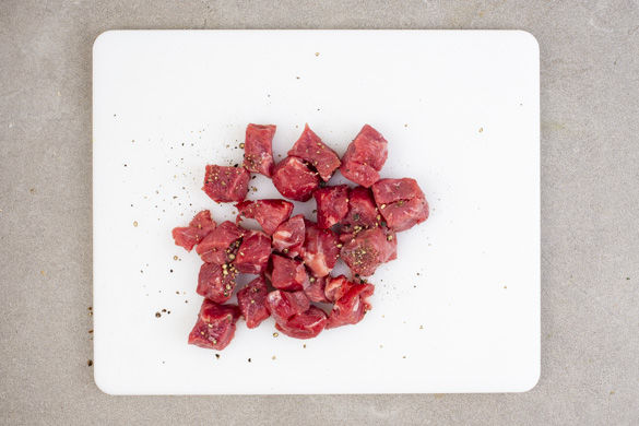 Das Fleisch mit etwas Küchenkrepp trocken tupfen, in ca. 1cm große Würfel schneiden und mit Salz und Pfeffer würzen.