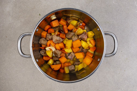 Das Fleisch in einem großen Topf mit 1–2EL Olivenöl bei starker Hitze ca. 2–3Min. scharf anbraten. Die Zwiebeln, den Knoblauch, die Süßkartoffeln, die Kartoffeln und die Karotten dazugeben und ca. 2Min. mitbraten.