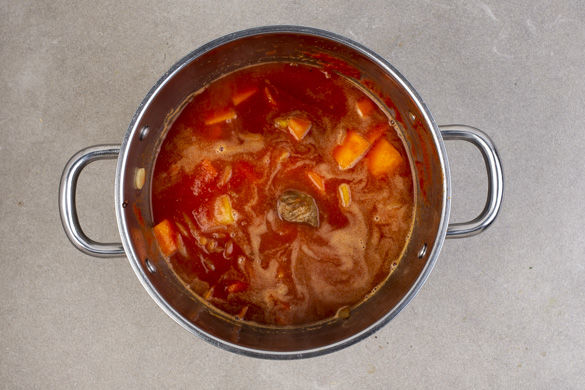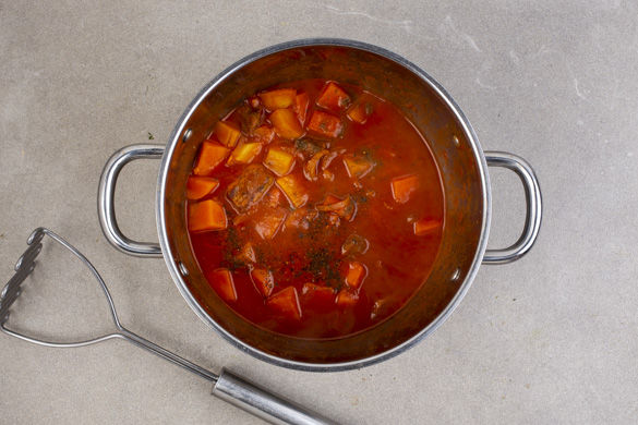 Das Gemüse und Fleisch mit dem Kreuzkümmel und dem geräucherten Paprikapulver nach Geschmack bestäuben und mit den passierten Tomaten ablöschen. Dann 1L Wasser und die Brühwürfel hinzugeben und die Suppe 20–30Min. abgedeckt bei niedriger Temperatur sanft köcheln lassen, bis das Fleisch weich ist.