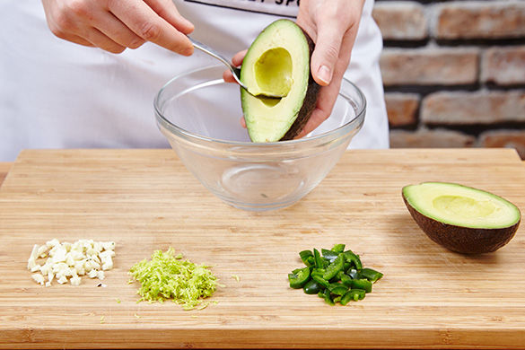Inzwischen die Avocado halbieren, den Kern entfernen und das Fruchtfleisch mit Hilfe eines Löffels herauslösen. Den Knoblauch schälen. Die Zitronenschale abreiben und den Saft auspressen. Die Chili halbieren, den Strunk und die Kerne entfernen und grob hacken. Wer's weniger scharf mag, verwendet nur 1/4 der Chili.