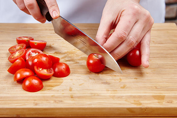 Die Tomaten halbieren und mit 1EL Essig , Salz, Pfeffer, Zucker und 1EL Olivenöl marinieren.
