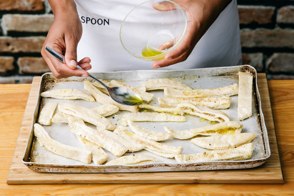 Das Pitabrot in 1–2cm breite Streifen schneiden und auf einem Backblech verteilen. Den restlichen Knoblauch durch eine Knoblauchpresse drücken oder mit einer Gabel und etwas Salz zerreiben und mit 1–2EL Olivenöl vermischen. Das Knoblauchöl über die Brotstreifen träufeln und diese im Ofen ca. 5–6Min. grillen.