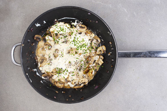 Die Zwiebelwürfel in einer großen Pfanne mit 1–2EL Olivenöl bei mittlerer Hitze 1–2Min. anbraten. Die Hitze erhöhen, die Champignons hinzugeben und ca. 5–8Min. anbraten. Die Hitze wieder reduzieren, die Crème fraîche unterrühren und alles 2–3Min. sanft köcheln lassen. Ca. 3/4 des Schnittlauches untermischen und die Sauce mit Salz und Pfeffer abschmecken.