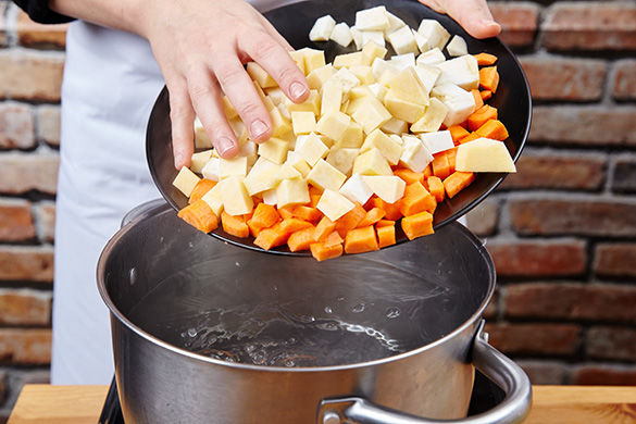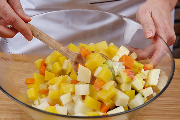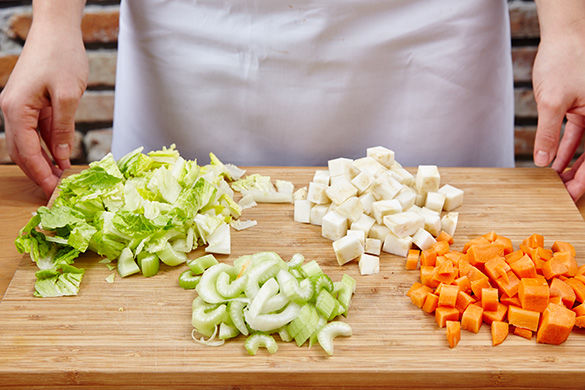 In einem mittelgroßen Topf ausreichend gesalzenes Wasser zum Kochen bringen. Knollensellerie und Karotten schälen und in ca. 1cm große Würfel schneiden. Den Salat in mundgerechte Stücke schneiden. Die Petersilie grob hacken. Den Apfel vierteln, vom Kerngehäuse befreien und in ca. 1cm große Würfel schneiden. Sellerie in dünne Scheiben schneiden.