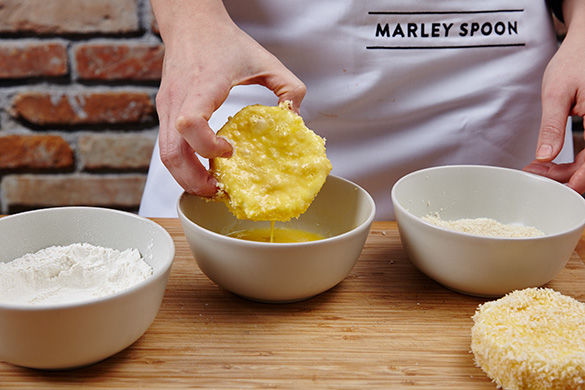 Inzwischen eine Schüssel mit 6-8EL Mehl, eine mit 2 verquirlten Eiern und eine Schüssel mit dem Panko-Paniermehl nebeneinander bereitstellen. Den Käse erst in dem Mehl, dann in dem Ei und schließlich in dem Paniermehl wenden. Dann den Käse erneut im Ei und ein weiteres Mal im Panielmehl wenden.