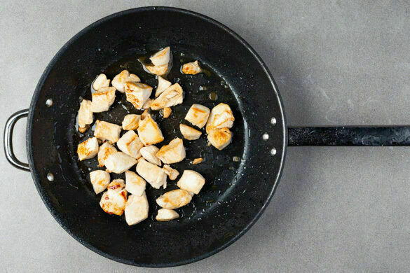 Das Fleisch in der Pfanne mit 2EL Pflanzenöl bei starker Hitze unter gelegentlichem Rühren 2–3Min. braten, bis es fast gar ist. Mit 1–2 kräftigen Prisen Salz würzen.