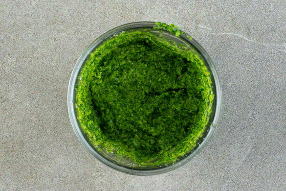 Die ½ des Rucolas mit den Sonnenblumenkernen, dem Knoblauch, dem Basilikum samt Stängeln, der ½ des Käses, 4EL Olivenöl, 2EL hellem Essig und 5–6EL Wasser in einem hohen Gefäß mit einem Stabmixer zu einem glatten Pesto pürieren. Mit je 1TL Salz und Pfeffer würzen, ggf. mehr Wasser hinzufügen.