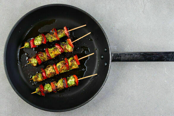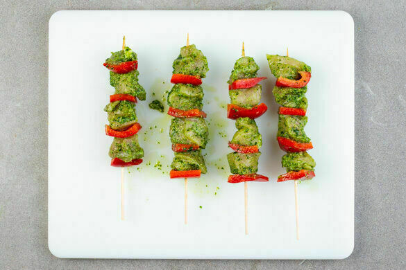 Heute wird’s spießig! Und damit meinen wir nicht die geblümte Wohnzimmertapete und wir wollen dir auch nicht vorschlagen, dein Auto mit dem Brillenputztuch zu wienern. Nein, heute ziehst du zartes Bio-Hähnchenbrustfilet und knackige Paprika auf Schaschlikspieße und brätst alles scharf an. Dazu reichst du knuspriges Pizzabrot mit würzigem Pesto, fruchtigen Tomaten, pikantem Käse und nussigem Rucola. So geht Spießbürger!