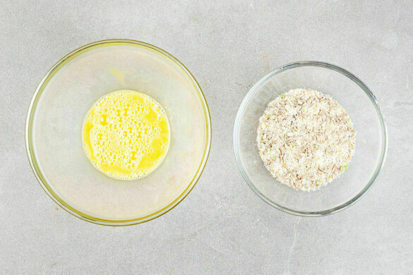Den Backofen auf 240°C (220°C Umluft) vorheizen. 4EL Olivenöl auf ein mit Backpapier ausgelegtes Backblech träufeln und in den Ofen schieben. Die Limettenschale abreiben, dann die Limette auspressen. 1 Ei mit 1EL Wasser sowie je 1 Prise Salz und Pfeffer verquirlen. Den Käse fein reiben und mit den Semmelbröseln, den Sonnenblumenkernen und der Limettenschale vermengen.