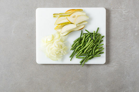 In einem großen Topf ausreichend gesalzenes Wasser für die Pasta und die Bohnen zum Kochen bringen. Die Enden der grünen Bohnen entfernen. Die Zwiebel schälen, halbieren und in Streifen schneiden. Die Birnen vierteln, vom Kerngehäuse befreien und in längliche Scheiben schneiden.