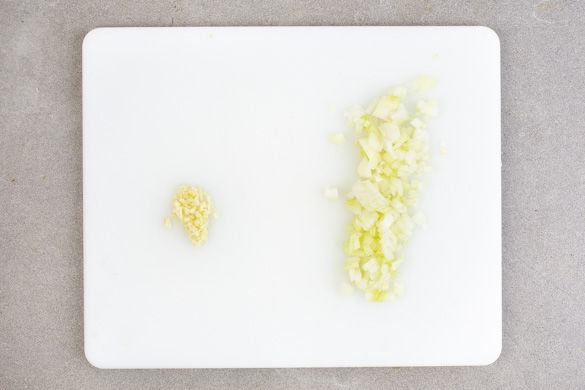 Den Backofen auf 180°C Umluft (200°C Ober-/ Unterhitze) vorheizen. In einem großen Topf ausreichend gesalzenes Wasser für die Pasta zum Kochen bringen. Die Zwiebel schälen, halbieren und in feine Würfel schneiden. Den Knoblauch schälen und fein hacken.