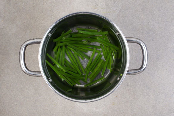 In einem kleinen Topf leicht gesalzenes Wasser für die Bohnen zum Kochen bringen. Die Enden der Bohnen abschneiden, dann die Bohnen quer halbieren und im kochenden Wasser in 4–5Min. bissfest kochen. Die Bohnen in ein Sieb abgießen, mit kaltem Wasser abschrecken und abtropfen lassen.