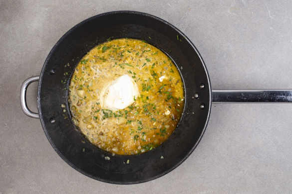 Die 1/2 der Zwiebeln in der Pfanne mit 1EL Olivenöl bei mittlerer Hitze ca. 1Min. glasig anbraten. Mit 1/2EL Mehl bestäuben, das Mehl unterrühren und die Zwiebeln mit 250ml Wasser ablöschen. Den Brühwürfel hineinbröseln und alles ca. 3–4Min. köcheln lassen. Die Crème fraîche und die 1/2 des Estragons unterrühren und die Pfanne vom Herd nehmen.