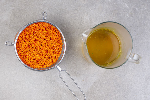 Den Brühwürfel in 1,5L heißem Wasser auflösen. Die Linsen in einem Sieb mit lauwarmem Wasser waschen.