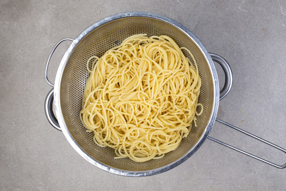 In einem großen Topf ausreichend gesalzenes Wasser für die Pasta zum Kochen bringen. Sobald das Wasser kocht 2/3 der Pasta hineingeben und in ca. 7–9Min. bissfest kochen. Tipp: Wer großen Hunger hat, kann auch alle Nudeln verwenden. Die Pasta in ein Sieb abgießen und warm halten.