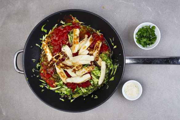 Das Gemüse mit den gehackten Tomaten ablöschen und ca. 6Min. bei mittlerer Hitze köcheln lassen, dann den Halloumi untermischen. Die Basilikumblätter von den Stängeln zupfen und grob hacken. Den Käse fein reiben.