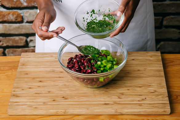 Die Bohnen in einem Sieb abgießen und mit kaltem Wasser kurz abspülen. Die Paprika halbieren, entkernen und in ca. 1cm kleine Würfel schneiden. Die Petersilie bis auf 2EL mit 2-3EL Essig, 2EL Olivenöl, Salz und Pfeffer zu einem Dressing mischen. Bohnen und Paprika mit dem Dressing vermengen und bis zum Servieren ziehen lassen.