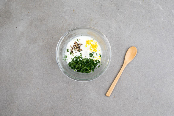 Währenddessen die Petersilie samt Stängeln fein hacken. Den Joghurt mit 1–2TL Zitronensaft, 1–2TL Zitronenabrieb und der Petersilie mischen und mit schwarzem Pfeffer abschmecken.