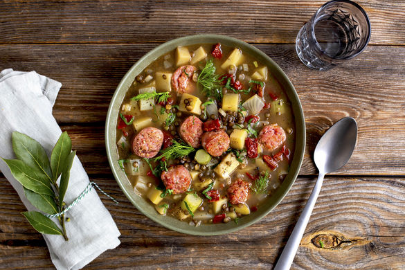 Dieser köstliche Eintopf mit grünen Linsen, Salsiccia-Wurst, getrockneten Tomaten und Fenchelstücken ist ein herzhaftes wie sättigendes Abendmahl. Dazu köchelt er auch noch ganz stressfrei auf dem Herd vor sich hin. Und sollte wirklich etwas übrig bleiben: Der Eintopf schmeckt – wie alle Eintöpfe – am nächsten Tag noch mindestens genauso gut!