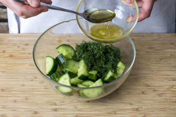 Die Dillspitzen abzupfen, fein schneiden und zu den Gurken geben. Den Salat mit 2EL Pflanzenöl, 2EL Essig sowie Pfeffer und Zucker abschmecken und bis zum Servieren ziehen lassen.