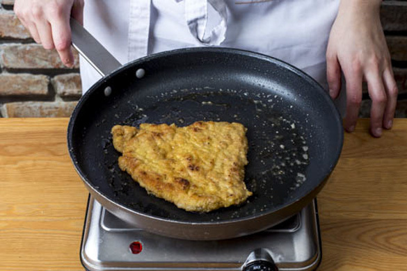 Die Schnitzel von beiden Seiten mit Salz und Pfeffer würzen. 4EL Mehl, 2 verquirlte Eier und die Semmelbrösel in je einen tiefen Teller oder eine Schüssel geben und die Schnitzel der Reihe nach im Mehl, im Ei und in den Semmelbröseln wenden, bis das Fleisch gleichmäßig bedeckt ist.