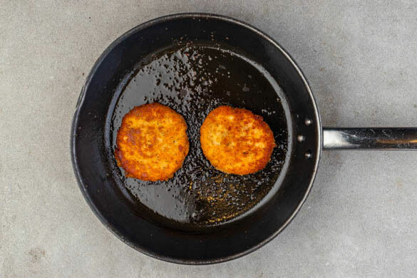 Die Pattys in einer mittelgroßen Pfanne mit 1EL Olivenöl bei mittlerer bis starker Hitze auf jeder Seite 3–5Min. goldbraun braten. Die Brötchen aufschneiden und 3–5Min. auf dem Backrost im Ofen aufbacken. Die Pattys aus der Pfanne nehmen und kurz beiseitestellen. Die Harissa, die Granatapfelmelasse und 1–2EL Wasser einrühren, bis eine glatte Sauce entsteht.