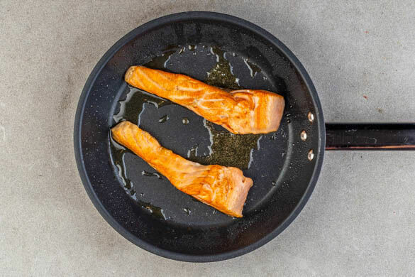 Den Fisch mit kaltem Wasser abspülen, trocken tupfen und evtl. vorhandene Gräten und Schuppen entfernen. Den Fisch auf der Hautseite mit 1EL Olivenöl in der aufbewahrten mittelgroßen Pfanne bei mittlerer bis starker Hitze 3–5Min. anbraten. Dann vorsichtig wenden und in 1–2Min. gar braten. Die Pfanne vom Herd nehmen.