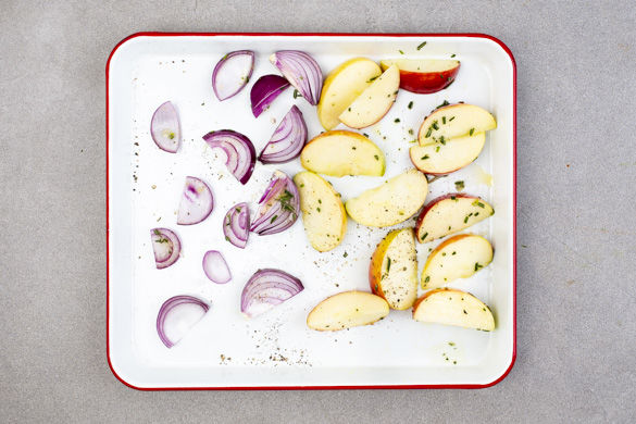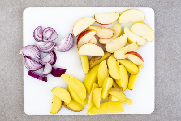 Den Backofen auf 200°C Umluft (220°C Ober-/Unterhitze) vorheizen. Die Kartoffeln halbieren und in gleich große Spalten schneiden. Die Äpfel vierteln, vom Kerngehäuse befreien und die Viertel in Spalten schneiden. Die Zwiebel schälen, halbieren und in grobe Streifen schneiden.