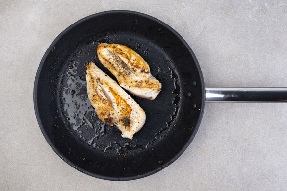 Das Hähnchen mit etwas Küchenkrepp trocken tupfen, mit Salz und Pfeffer würzen und in einer mittelgroßen Pfanne mit 1–2EL Olivenöl bei mittlerer Hitze auf jeder Seite ca. 2–3Min. anbraten.