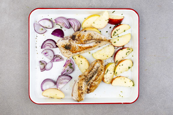 Das Hähnchen auf die Äpfel und die Zwiebeln legen, die Auflaufform zu den Kartoffeln in den Ofen geben und alles ca. 10–12Min. backen.